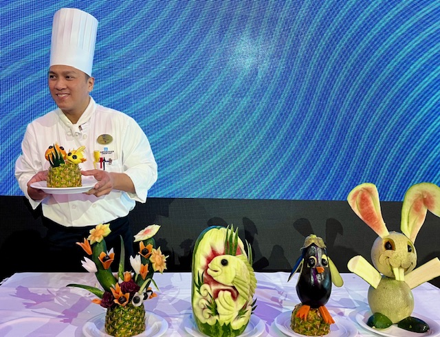 Live in front of an audience, a ship’s chef showed step by step how he makes adorable creatures – from a cantaloupe bunny to an eggplant penguin to adorable citrus fish perched on a pineapple.
