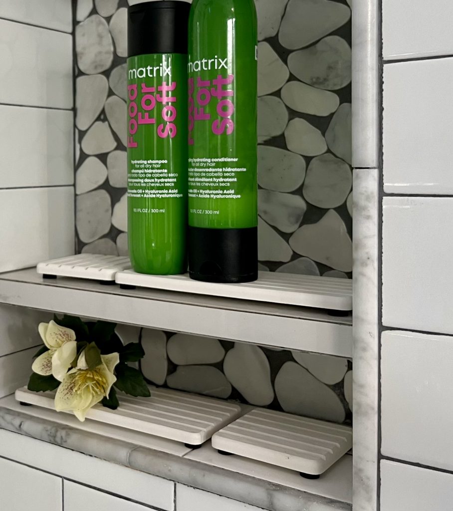 These absorbent stone trays can be used in a variety of places—kitchen counters, vanities, under plants—but I picked them up specifically for our shower niche.