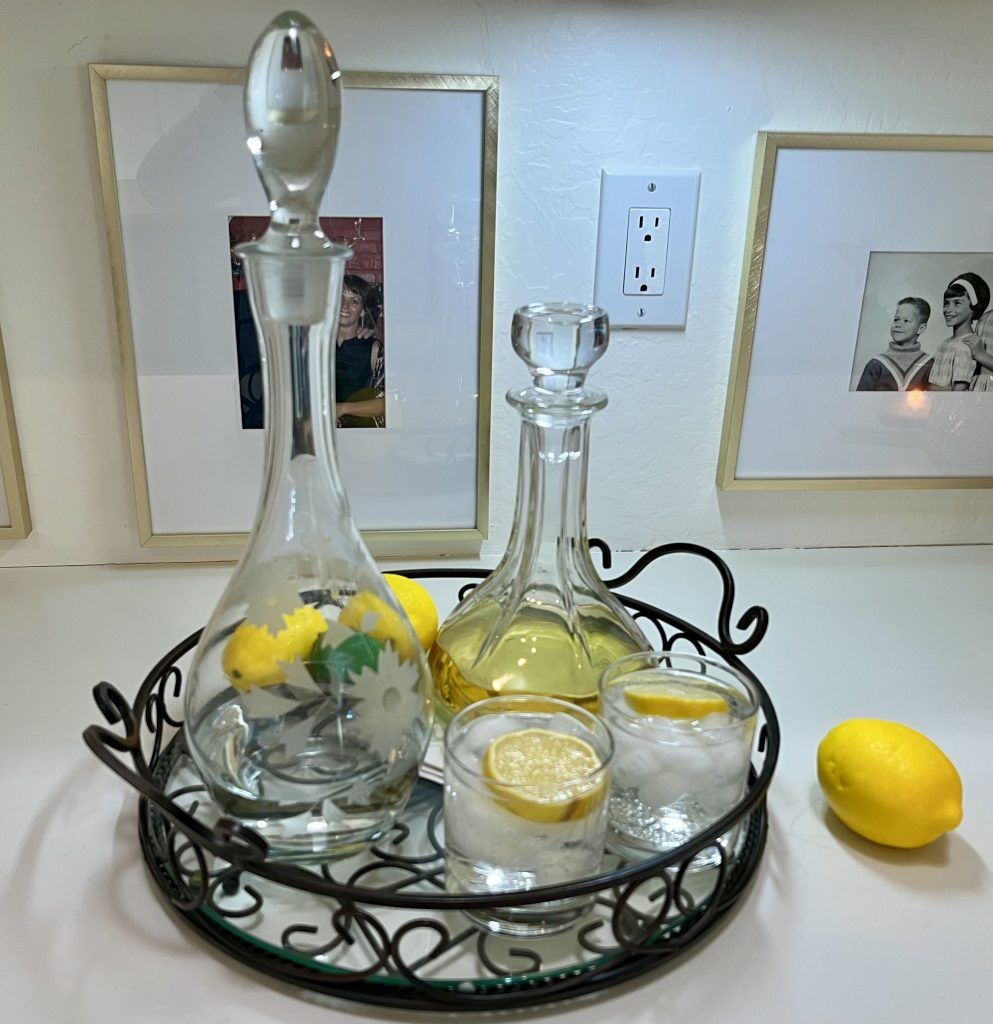 Hub rarely drinks at all and I only drink wine, but finding these beautiful crystal decanters at the thrift shop make the bar look “elevated.”  Right?