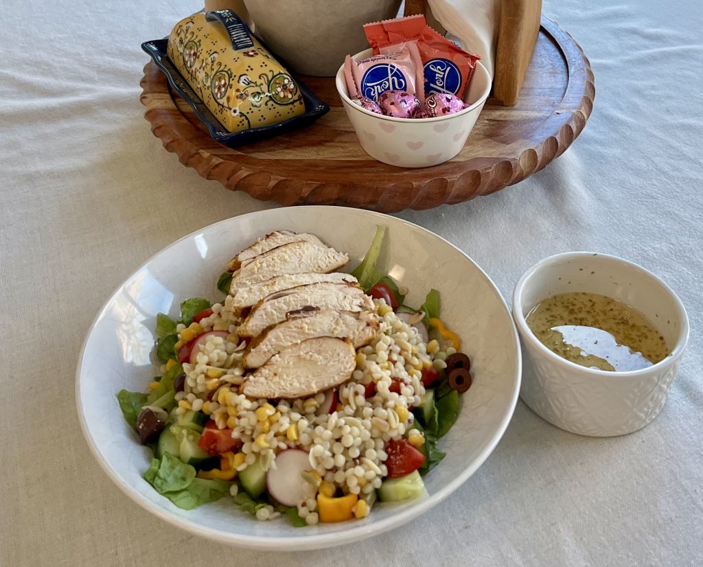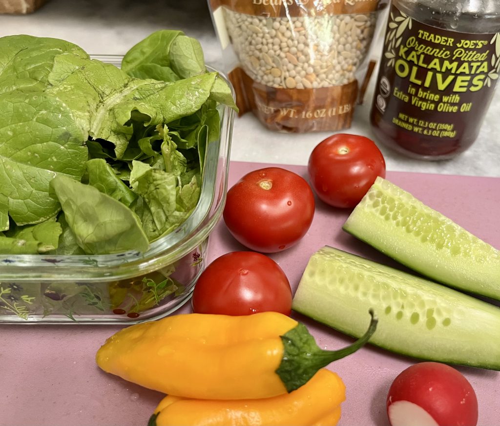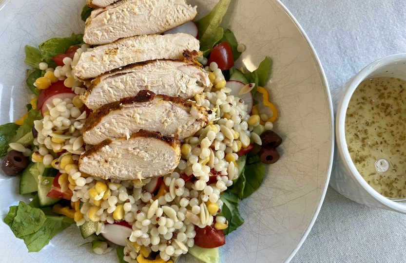 Salad fixings you love best, Trader Joe’s Harvest Blend, a spicy homemade rub on grilled or pan-fried chicken and a homemade Greek dressing all come together for a healthy take on comfort food.